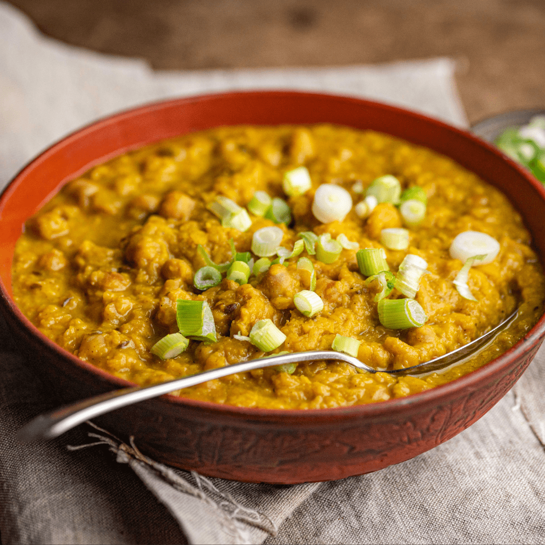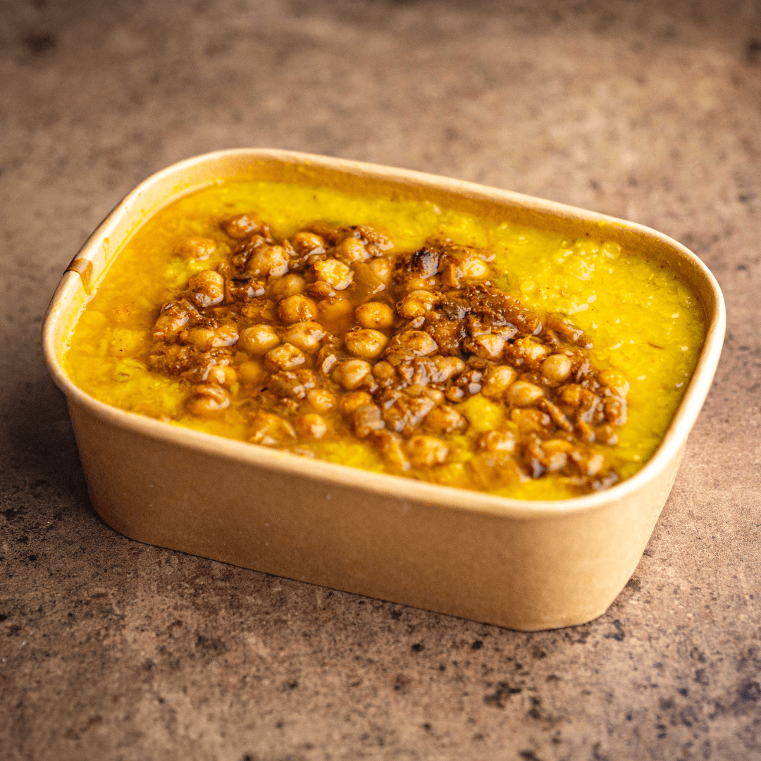 Daal – comforting and delicious! Our red lentil daal is made with smokey onoins, cumin and topped with spiced chickpeas. Eat with flaky flatbreads or coconut rice!